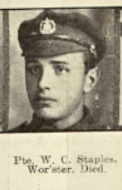 | Staples | William C. | 43691 | Dorsetshire Regiment | 23rd October 1918 | 18 | Born in Worcester circa 1900, enlisted in to The Dorsetshire Regiment in 1918 just ahead of their move to Northern Ireland where they were based in Londonderry. William died shortly after arriving in NI and was reported as deceased in War Office daily casualty reporting indicating a death on 23 October 1918. He was returned to his home town and buried at Astwood on 29 Oct 1918. | ![]() | 5637 |